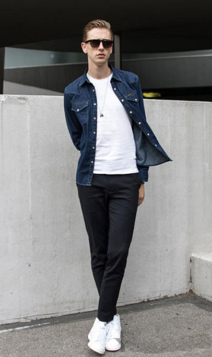 牛仔襯衫內(nèi)搭白色T恤+偏休閑的黑色窄腳小西服搭配一雙迷人的小白鞋,年輕和時(shí)尚感都非常強(qiáng)。