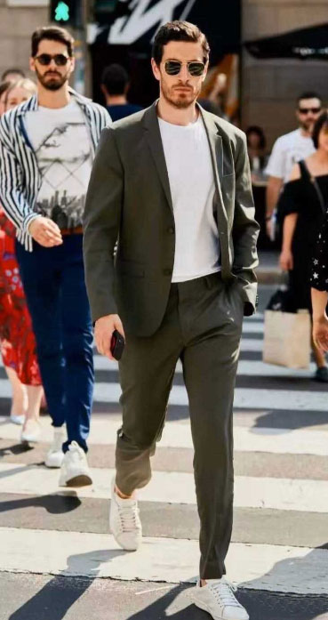 如果穿西裝褲搭配小白鞋,褲子盡量選擇偏休閑款的,盡量避免選擇比較正式的西裝褲。下面一些搭配圖片可供大家參考: