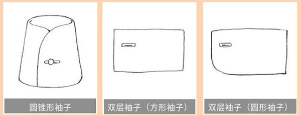 雙層袖子(方形袖子):此款為翻折后的雙重狀的袖子款式,憑借袖口的紐扣進行固定。具有較高的裝飾性,給人很正式的印象。
